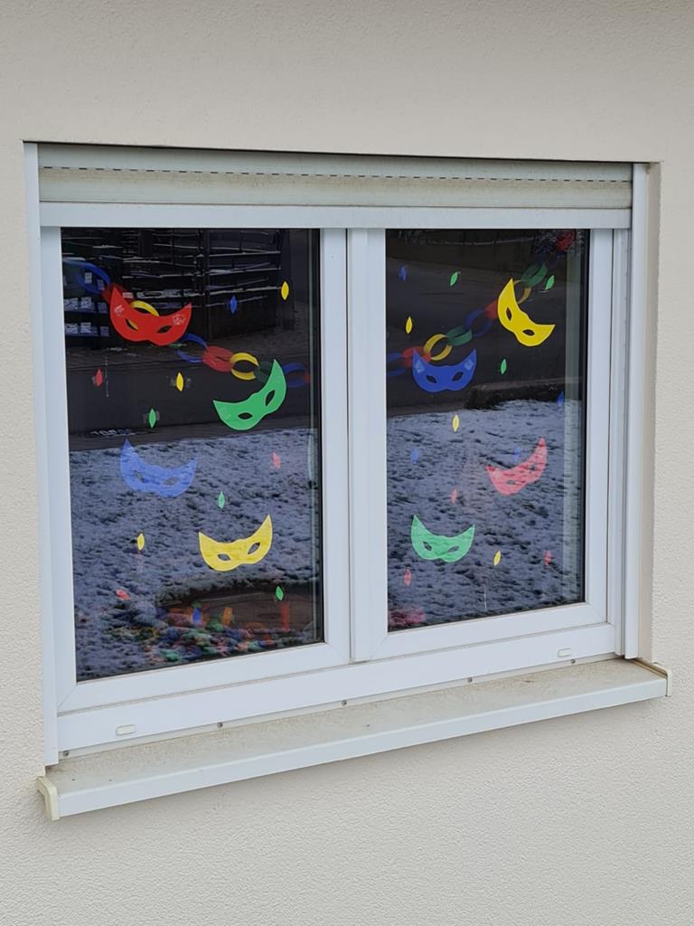 Und damit auch ja niemand vergisst, dass das hier eine Hochburg der Fastnacht ist, wurde auch die Gemeindehalle auf die 5. Jahreszeit „getrimmt“ - rein äußerlich und voll corona-konform versteht sich. So wird jedem Betrachter im Vorübergehen oder –fahren beim Betrachten der bunt geschmückten Fenster und der Tür im Eingangsbereich klar, was dieses Jahr schmerzlich vermisst wird.