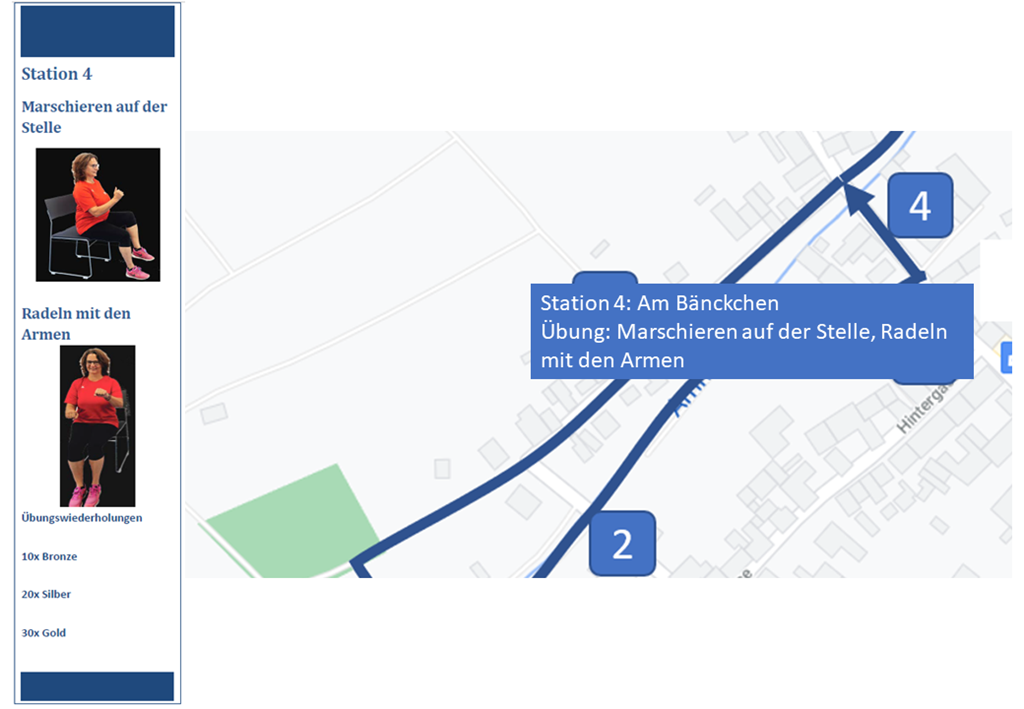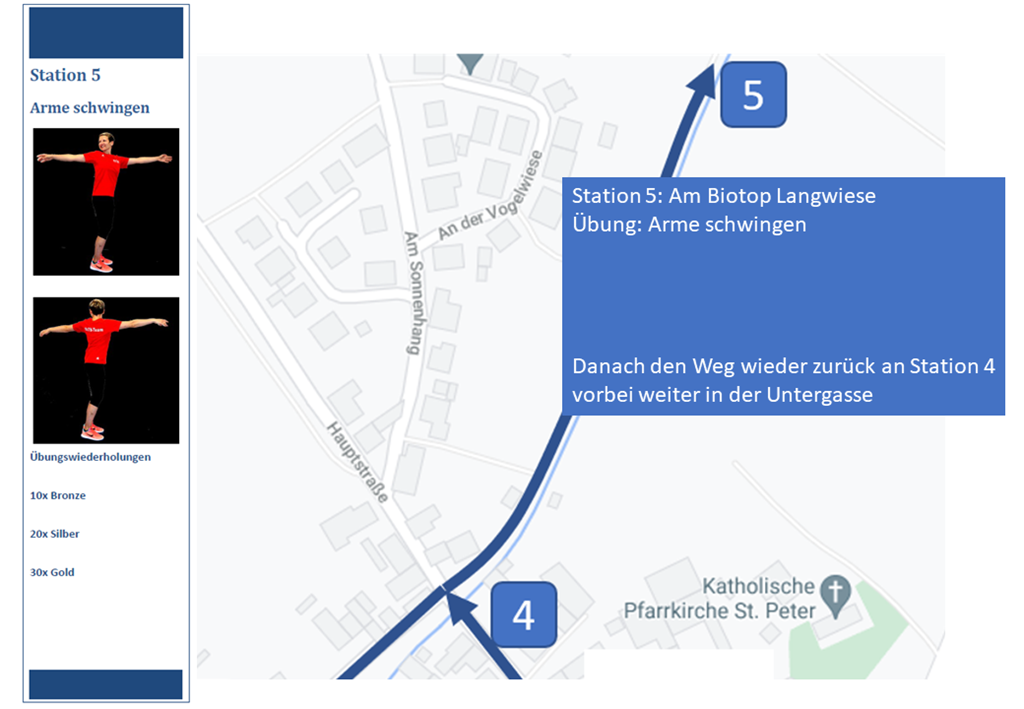 6. Station: An der Laterne in der Untergasse Ecke Wingertsberg sind die Übungen "Knie heben" und "Hackern mit den Unterarmen" dran. Danach geht es durch die Untergasse und unterhalb des Spielplatzes entlang wieder zurück zum Ausgangspunkt.