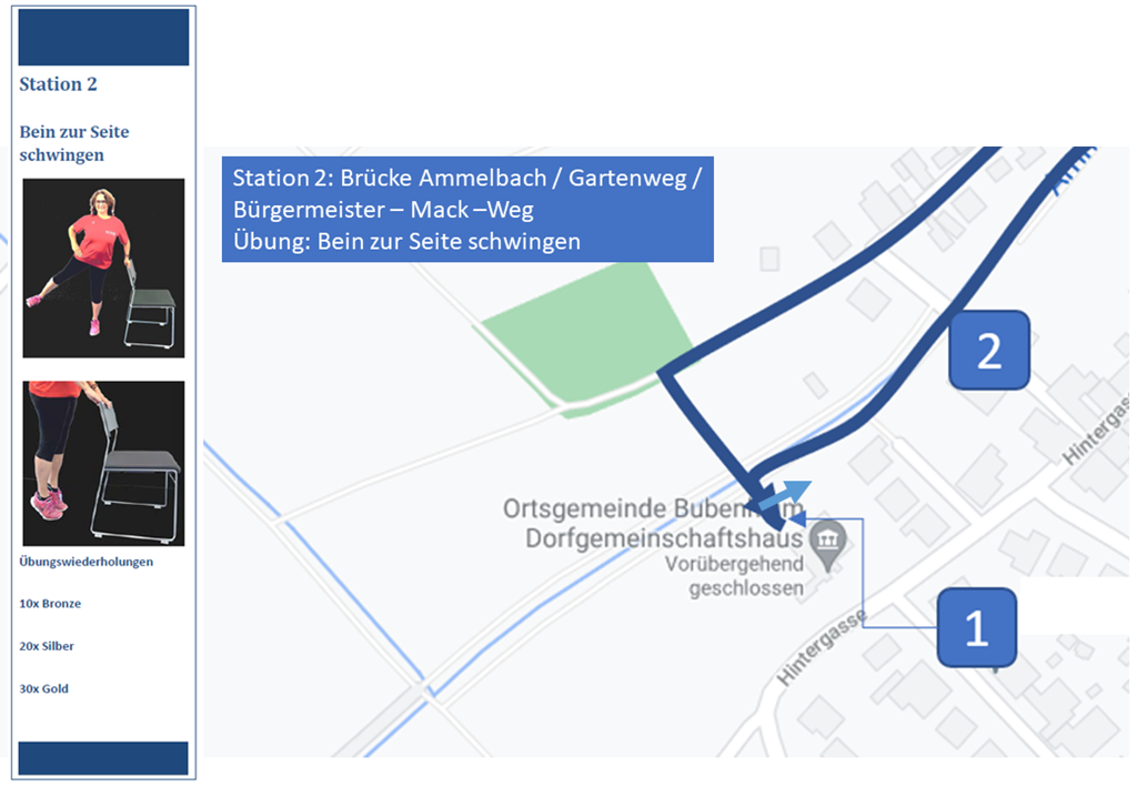 2. Station: Die Ammelbach entlang zum Gartenweg, am dortigen Brückengeländer kommt die 2. Übung: Bein zur Seite schwingen, danach geht es weiter durch den Bürgermeister-Mack-Weg zur